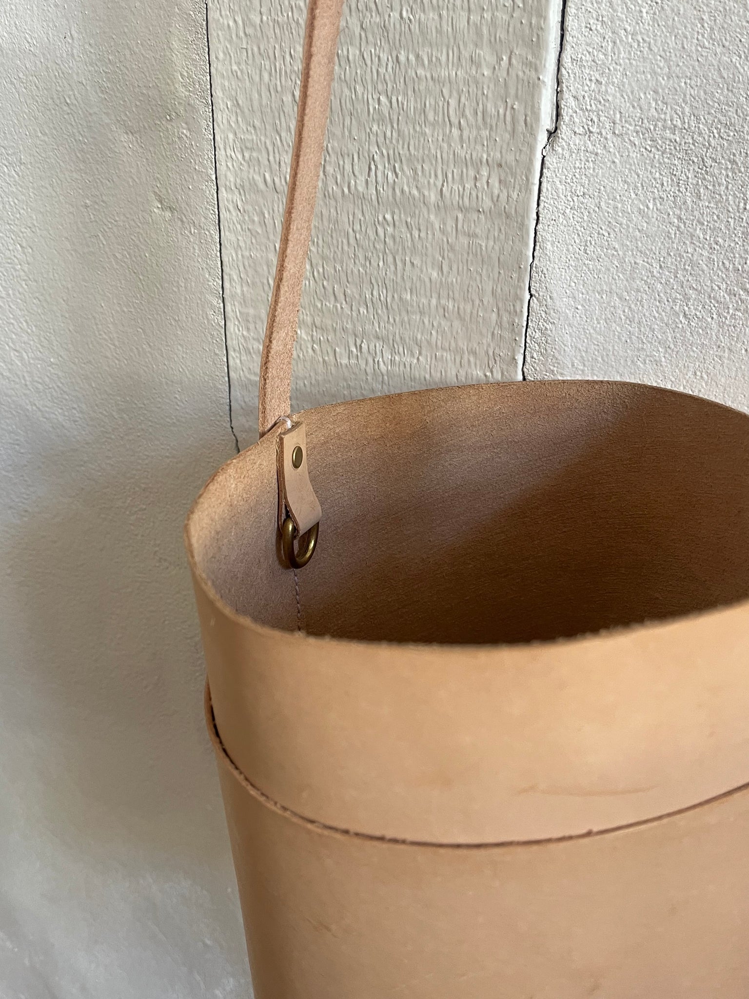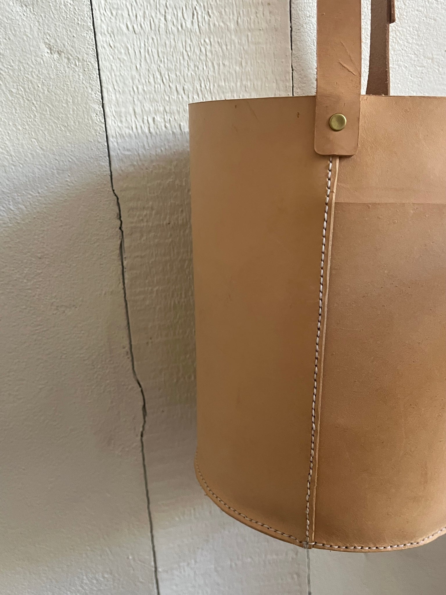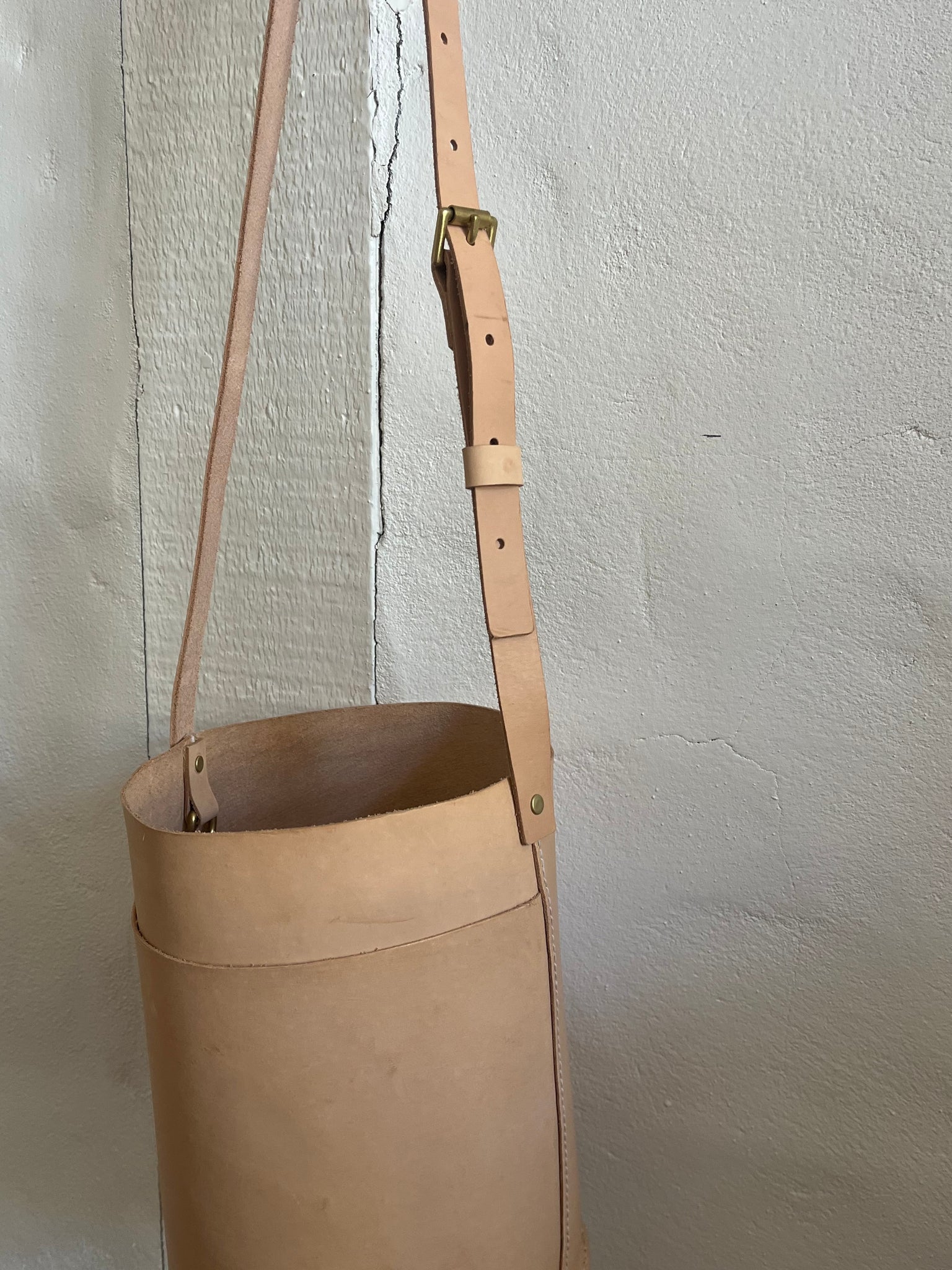 leather bucket bag made in house using high quality natural vegetable tanned leather and brass hardware and all completely hand stitched