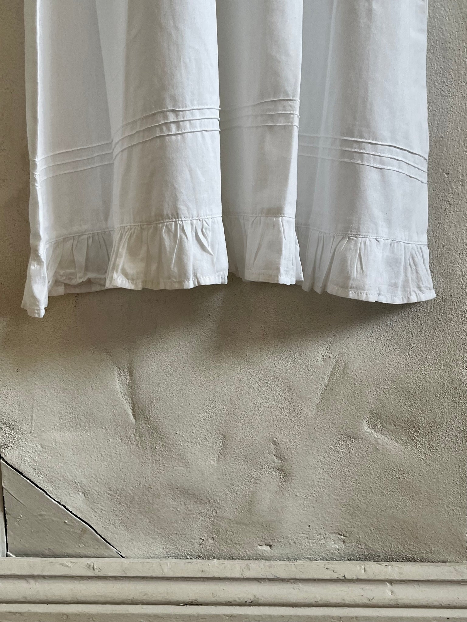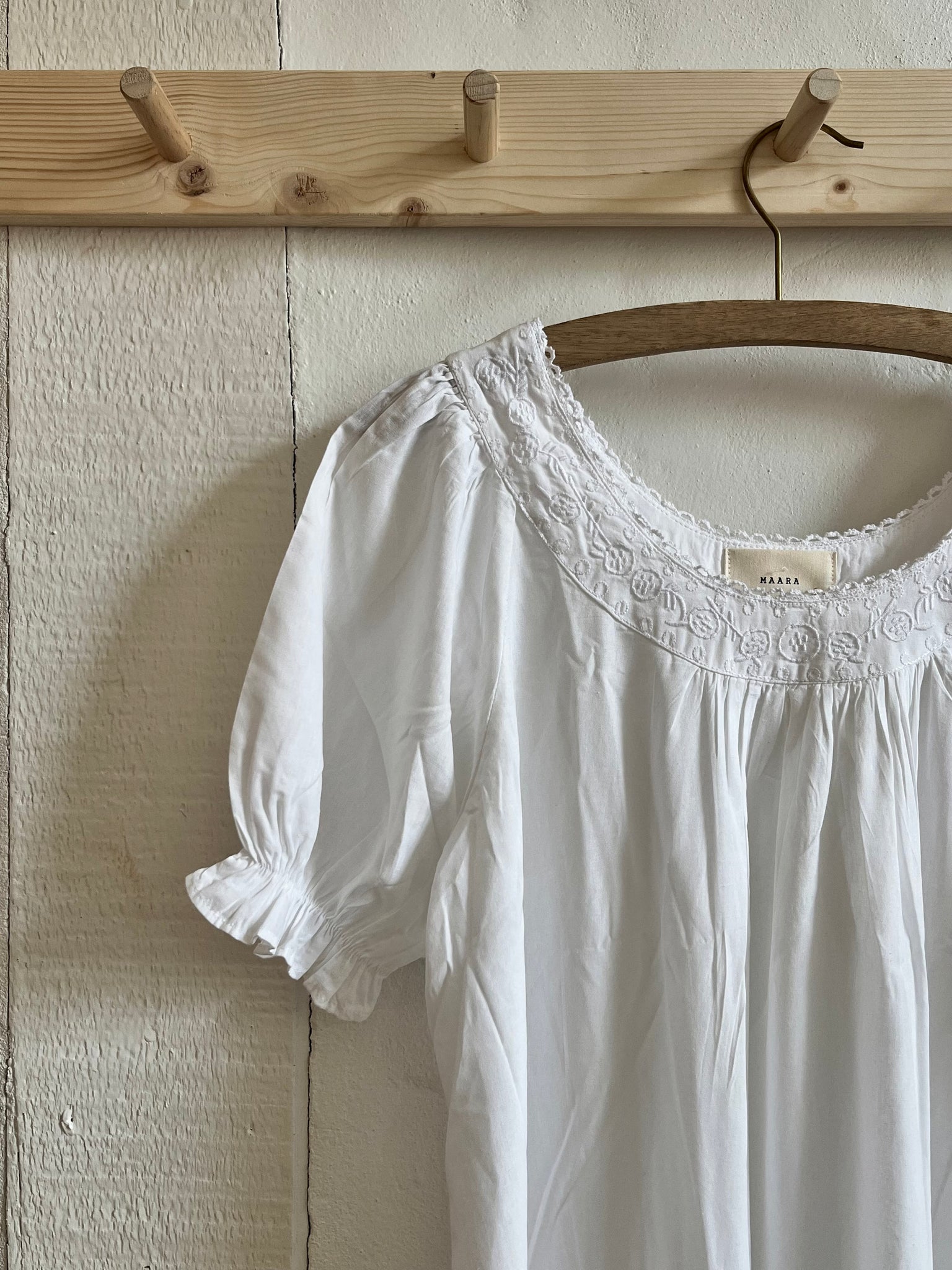 this house dress has subtle embroidery around the neckline , sweet puffed sleeves and pin tuck detailing around the hem.