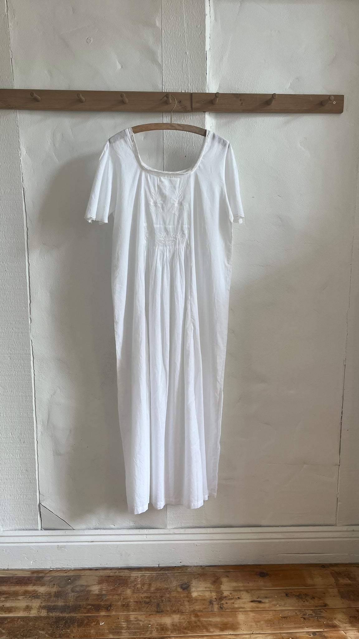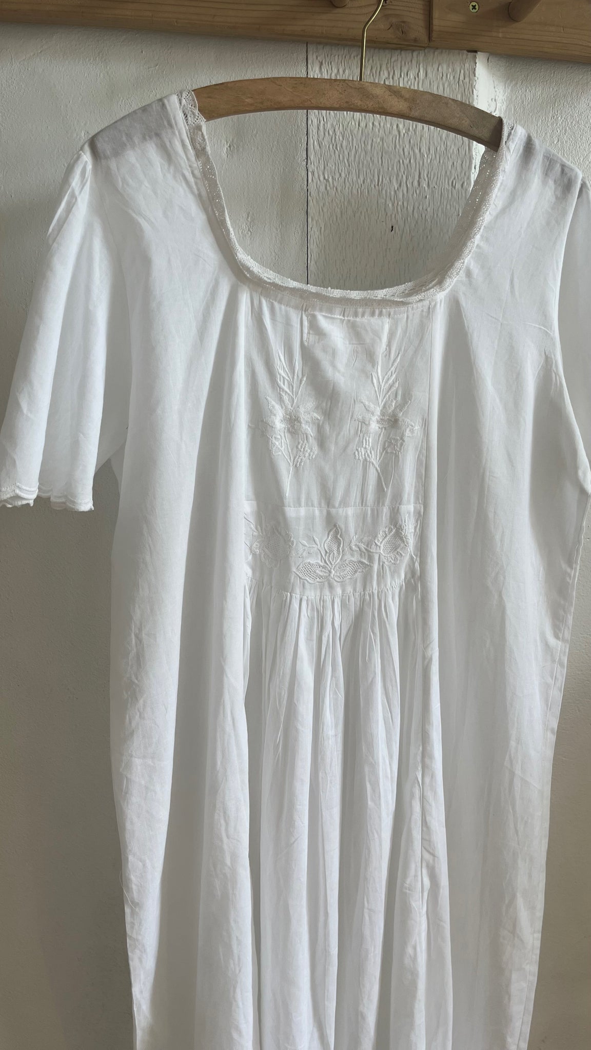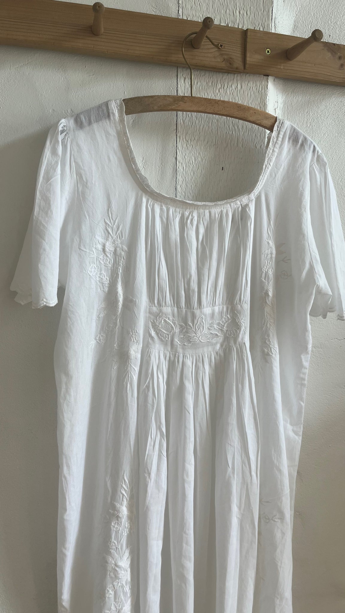 this house dress has a lower neckline, scalloped edge sleeves and a delicate lace detailing on the front and back.