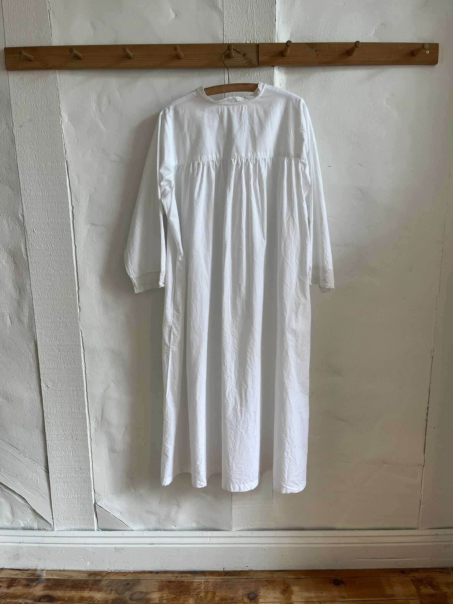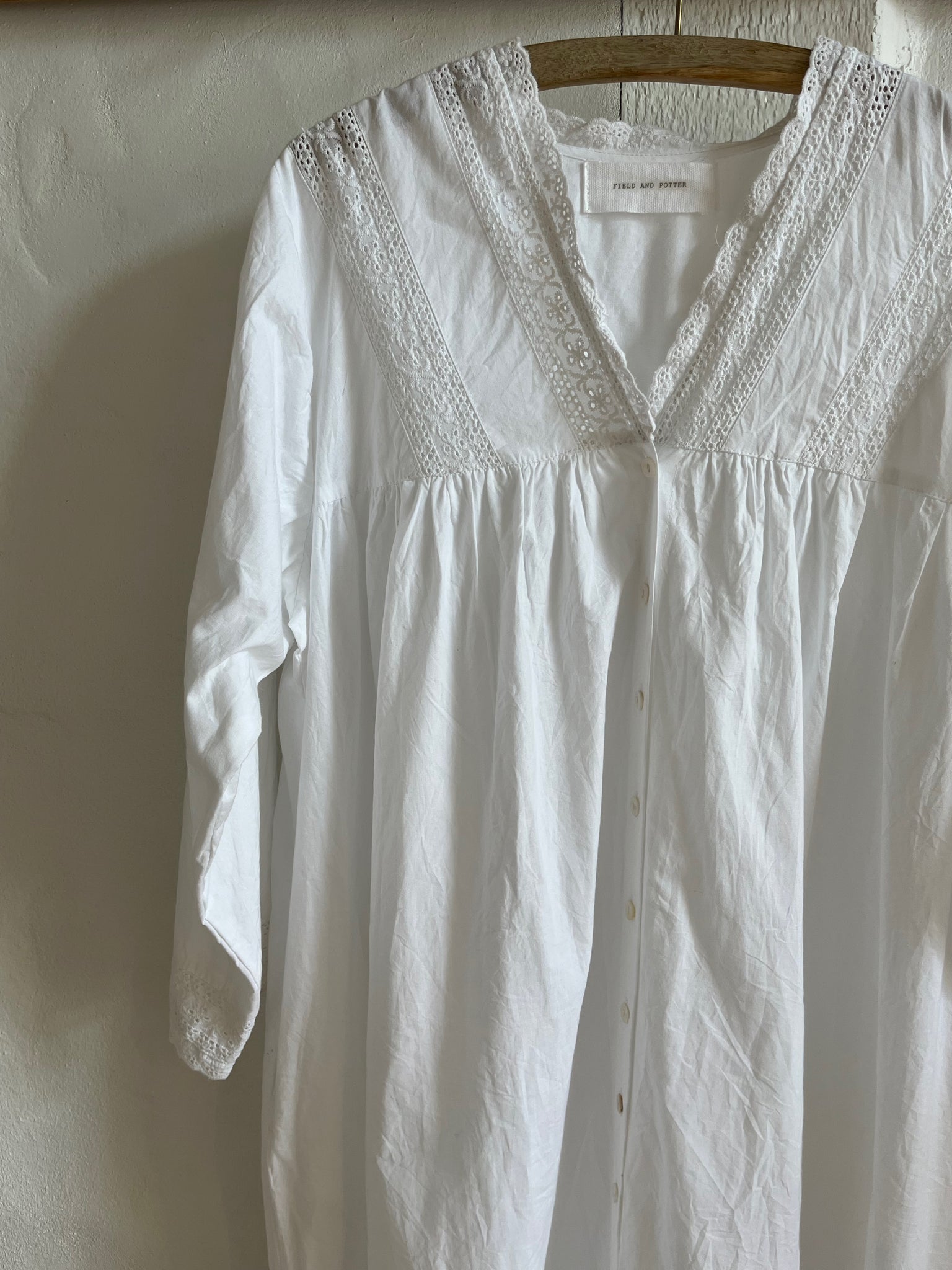this house dress is a medium weight cotton - meaning it is less sheer. It has beautiful mother of pearl buttons from neck to hem, and delicate cotton lace.
