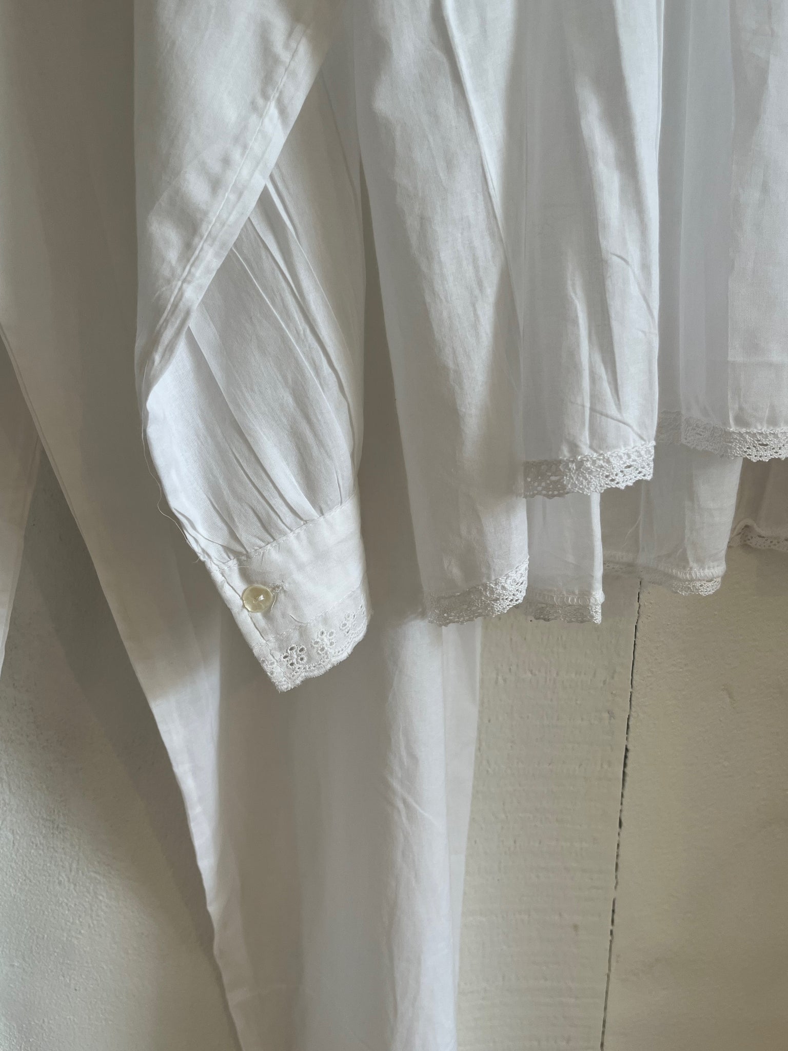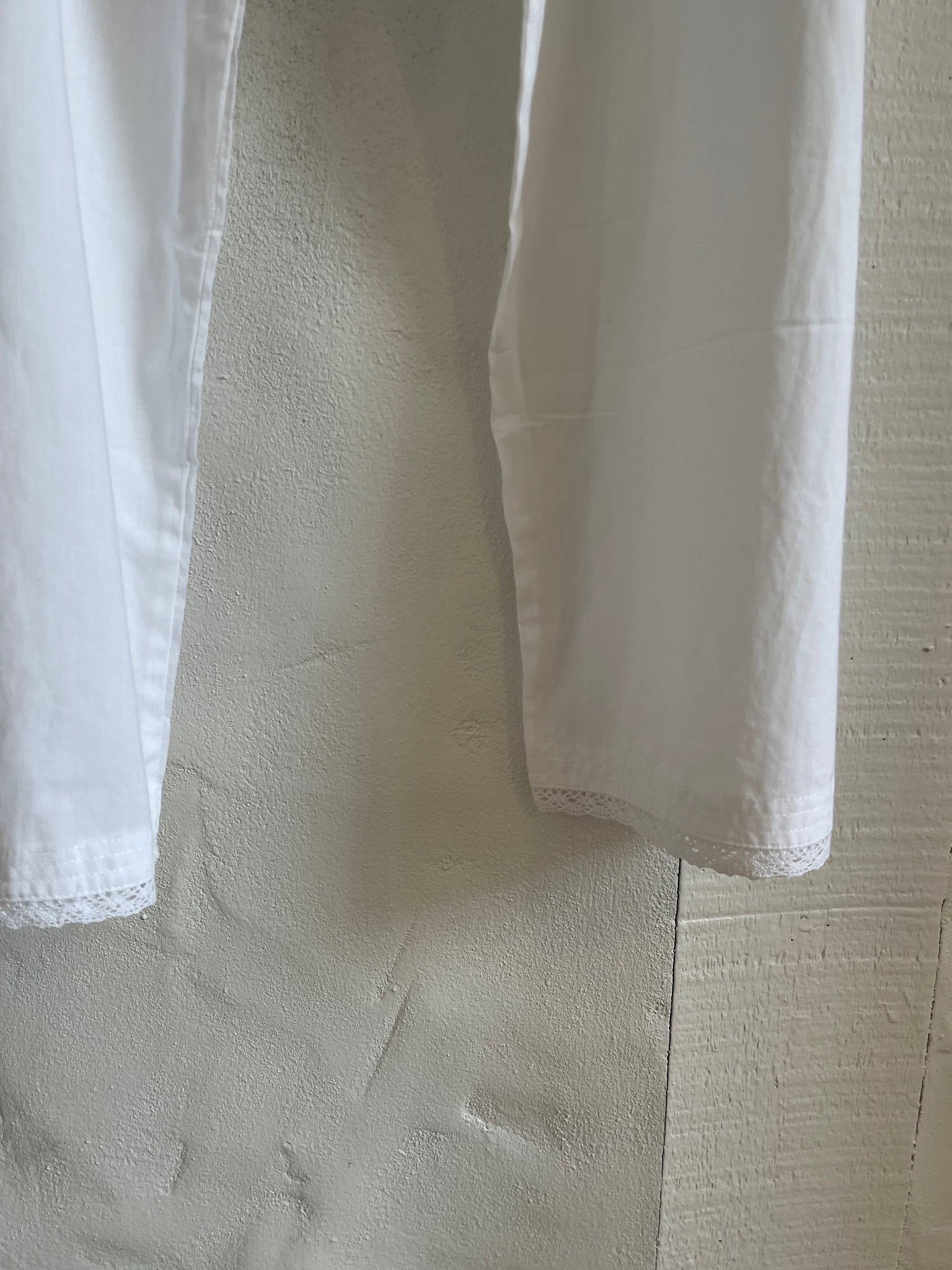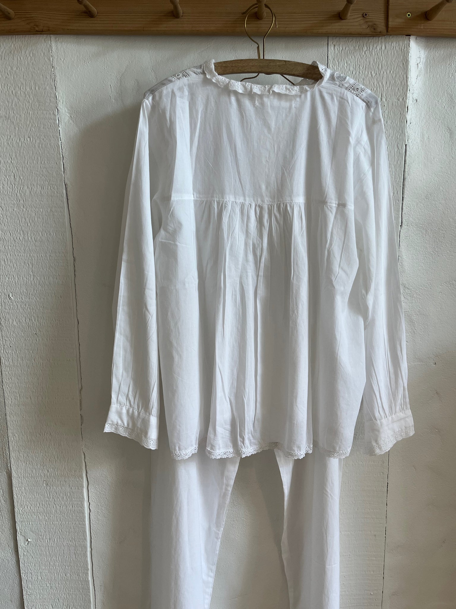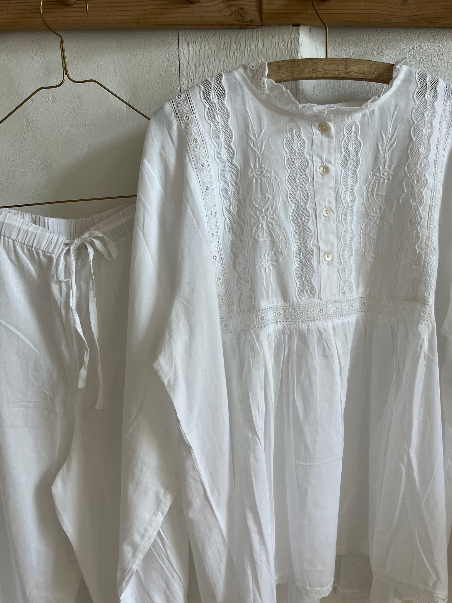 this house set is so pretty. the top has cotton lace and mother of pearl buttons and the pants have a drawstring waist.