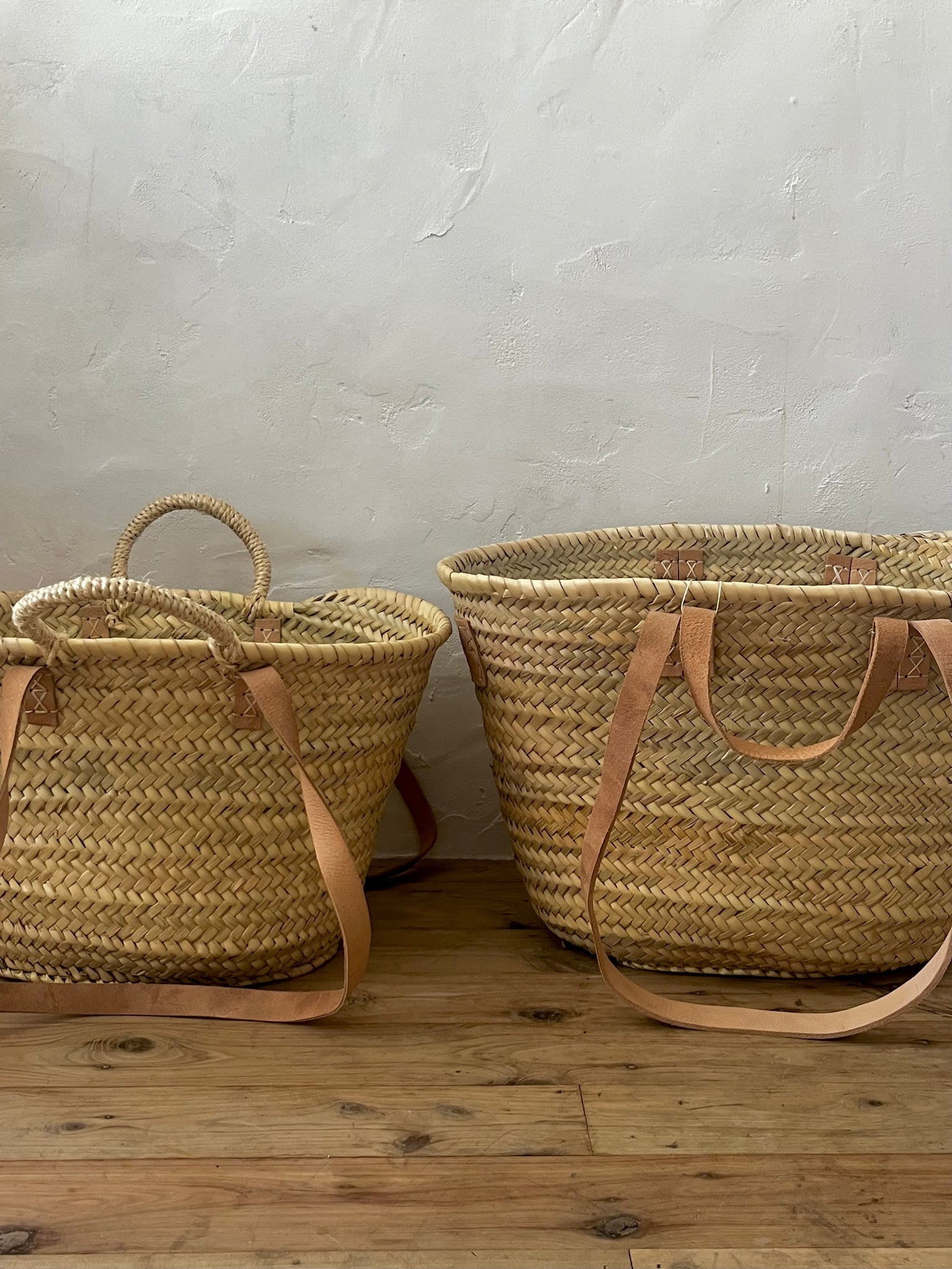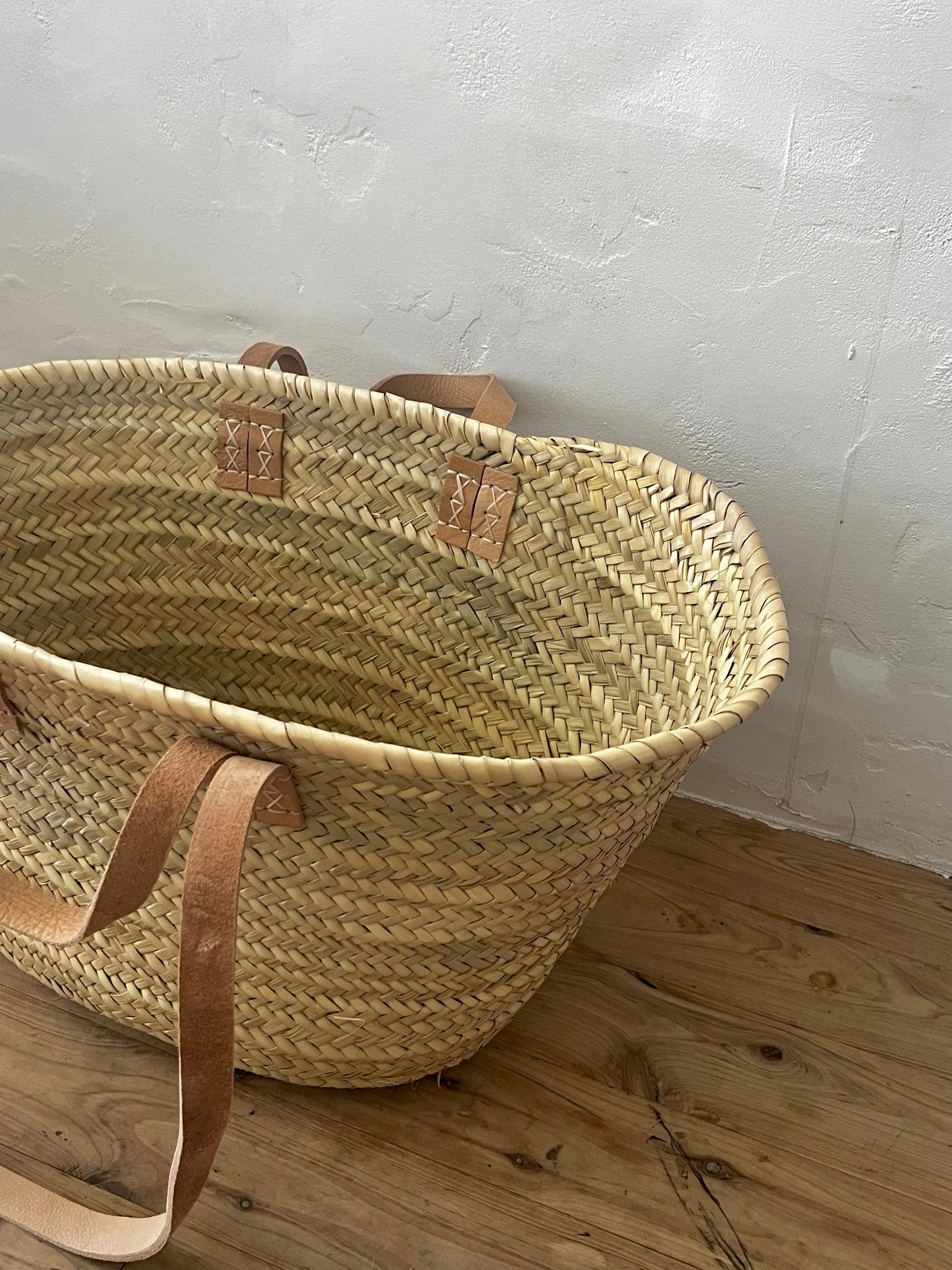 Made using natural and sustainable palm leaves. Handles are wrapped in natural veg tanned leather.