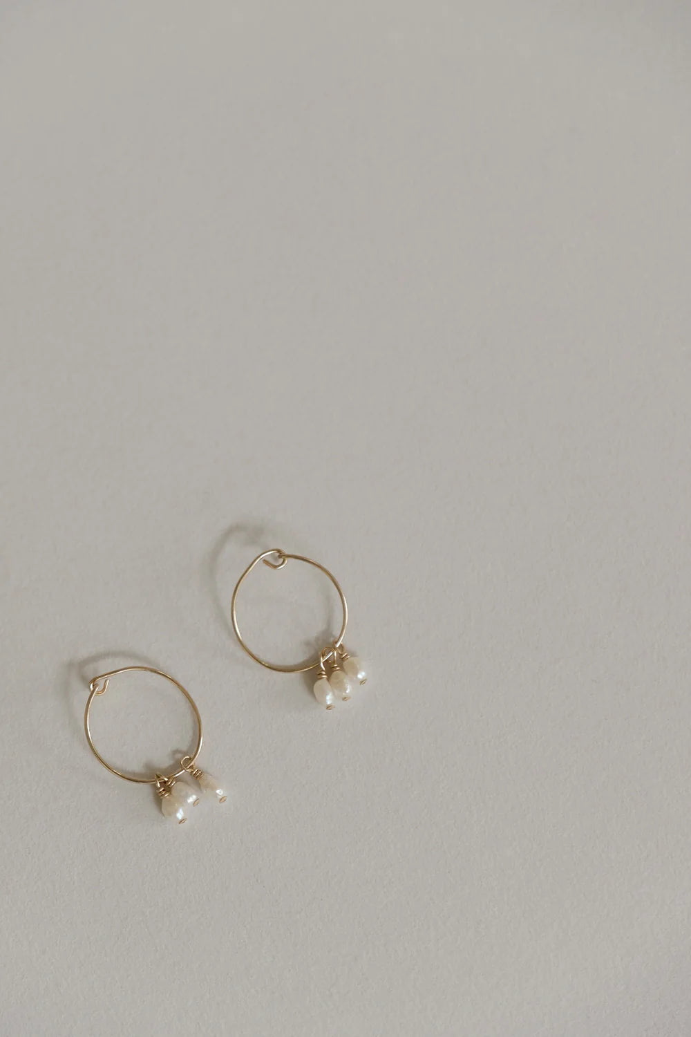 hand crafted freshwater pearls droplets on 14k gold filled hand shaped wire hoops.